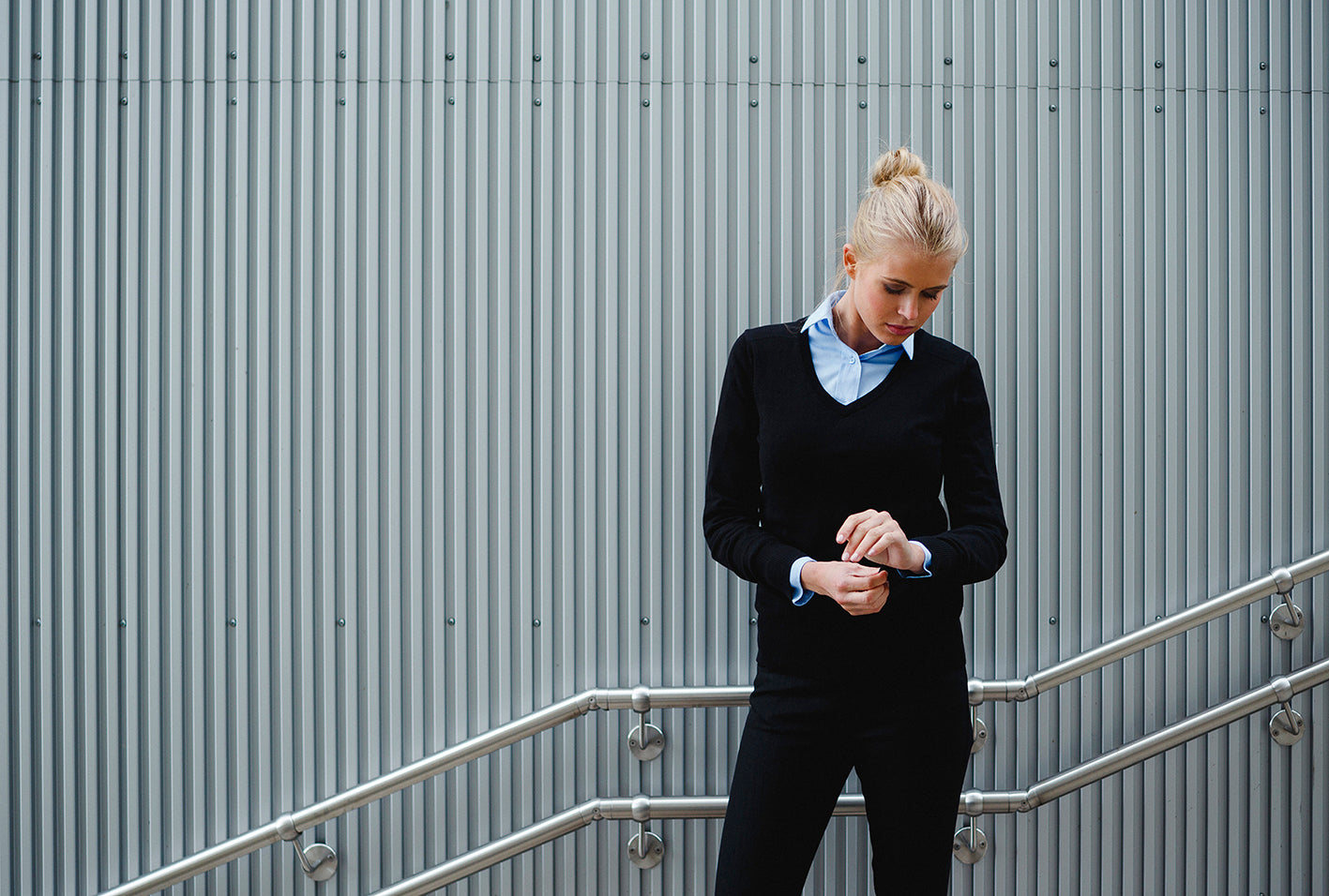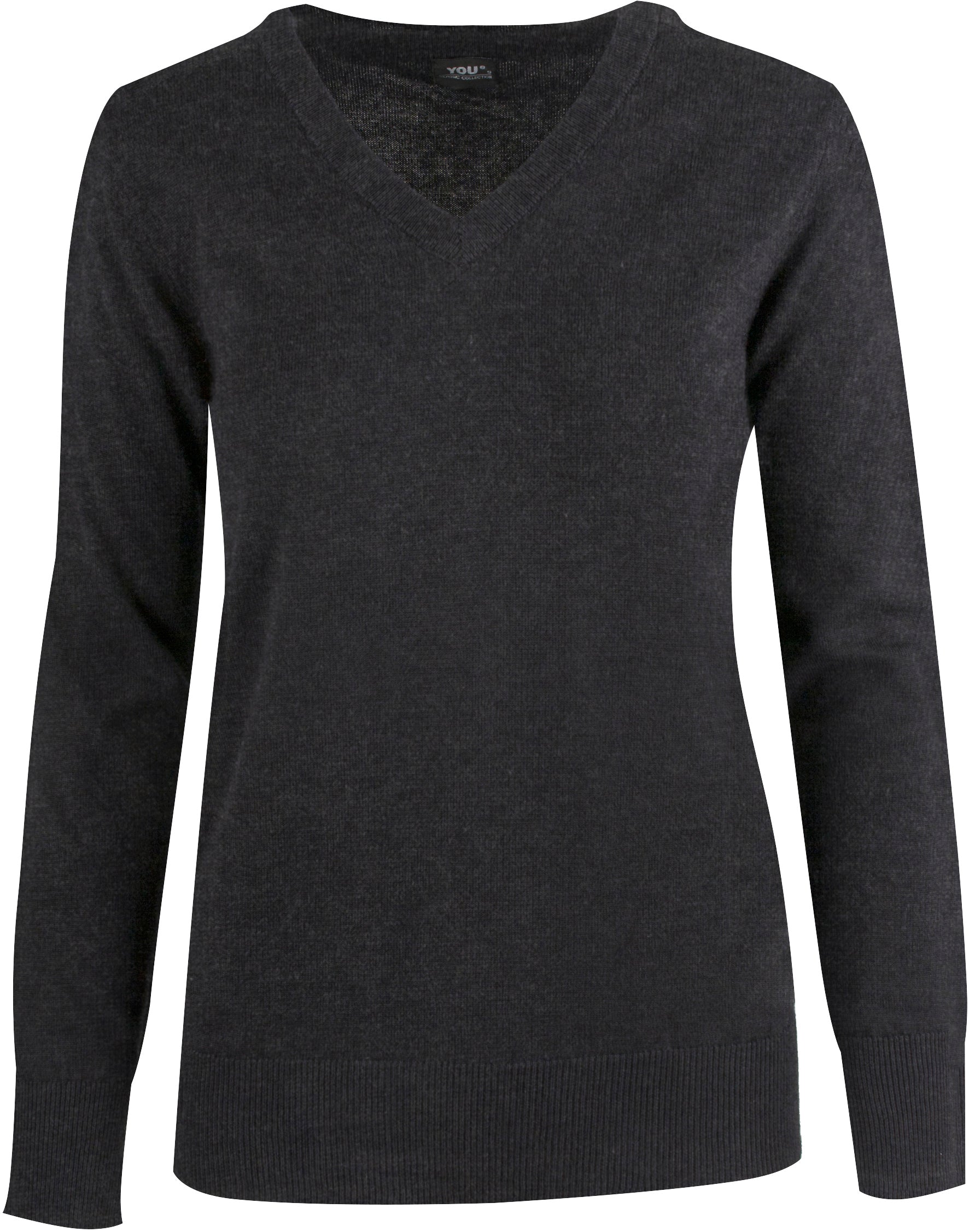 Klassisk finstrikket pullover til dame. V-hals og ribdetaljer i linning, hals og mansjetter. Passer utmerket utenpå skjorte eller t-shirt.