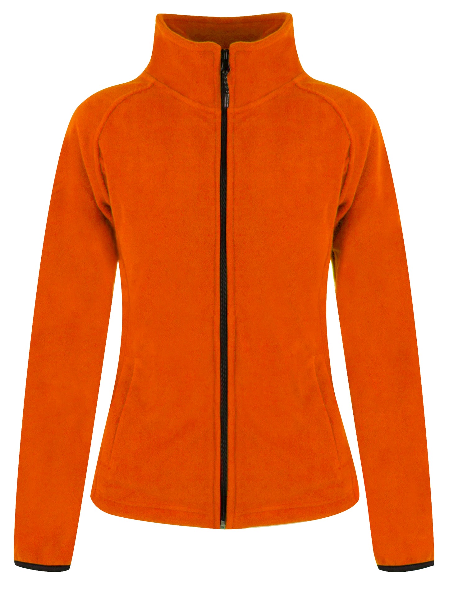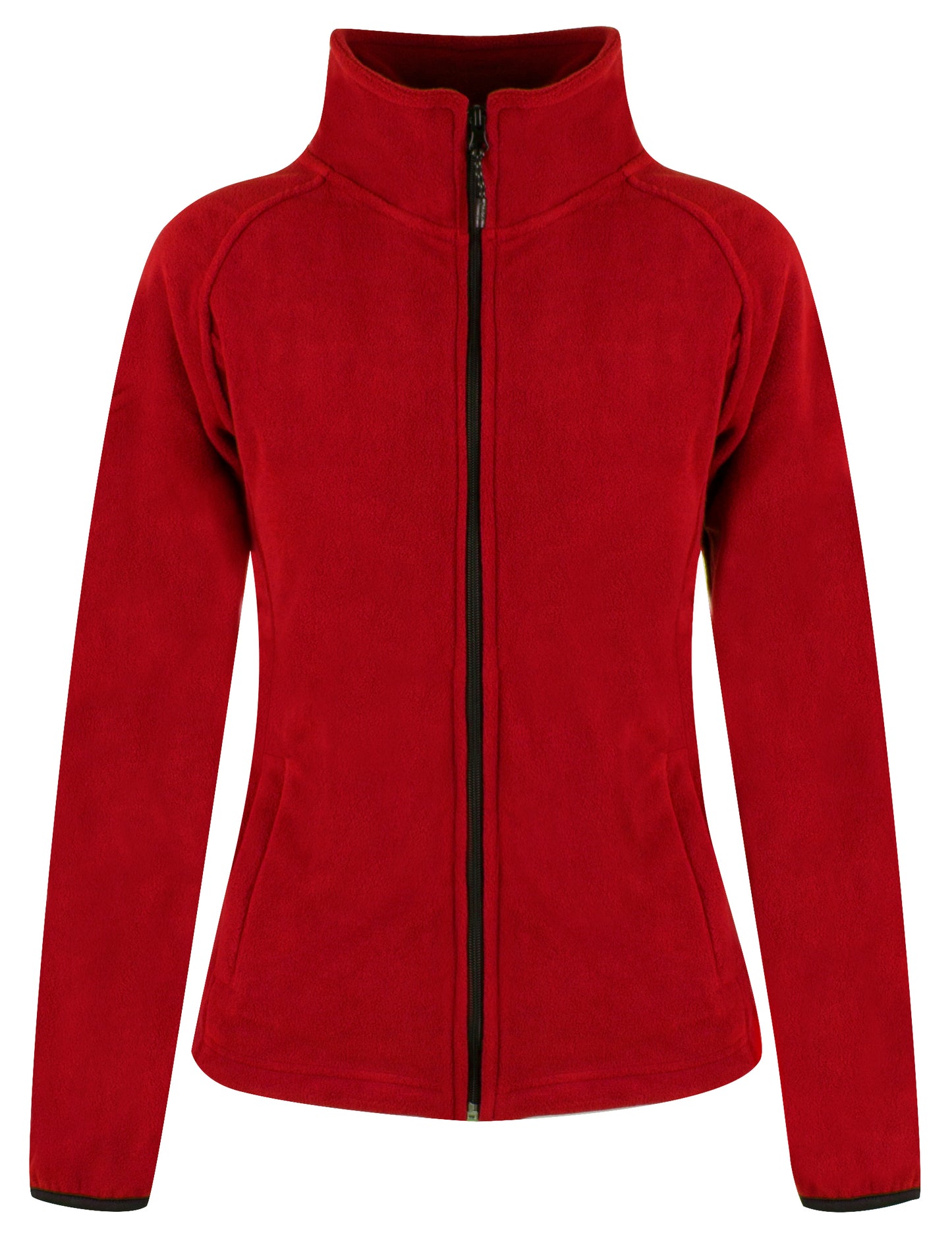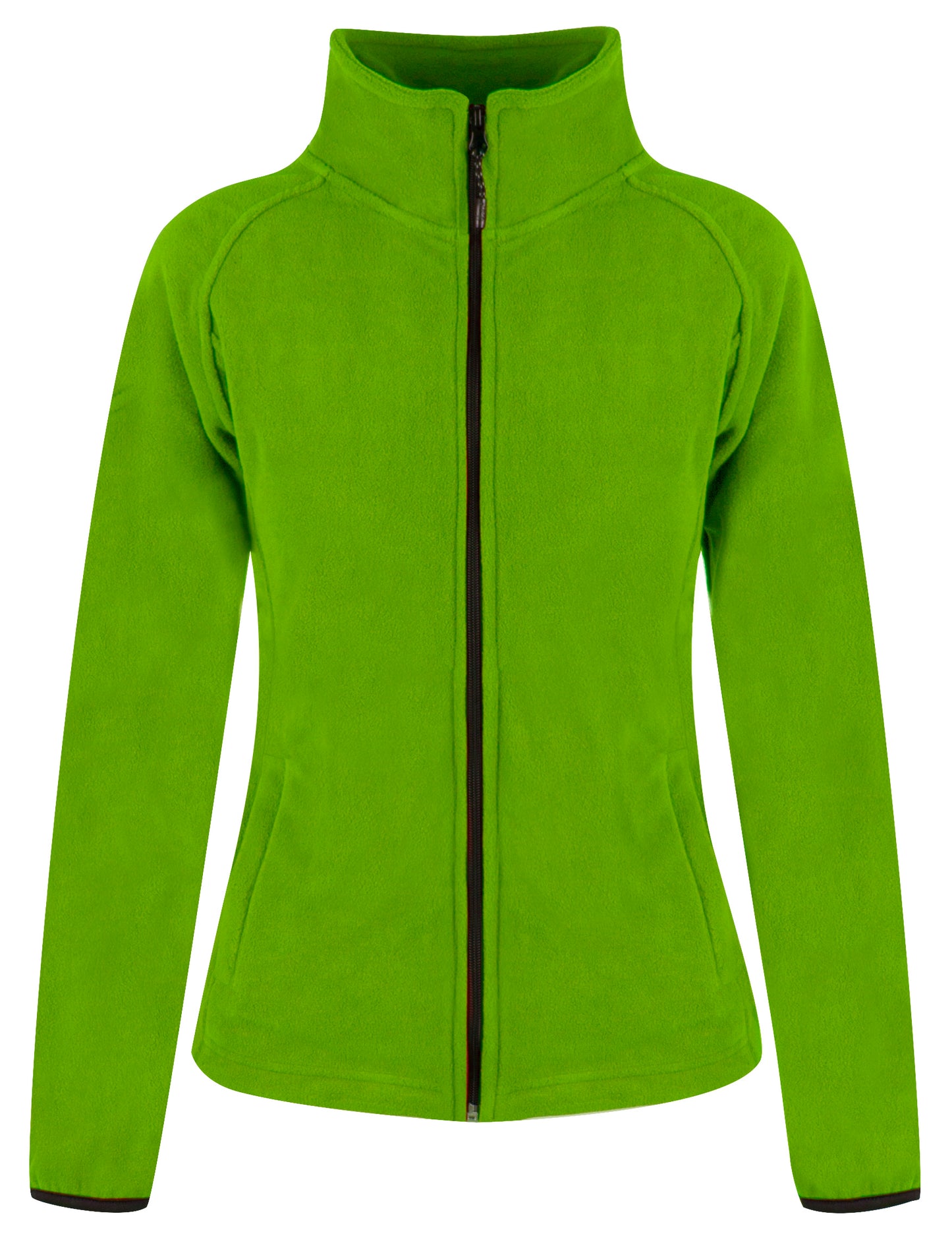Figursydd polarfleecejakke til dame. Elastisk kontrastpiping og praktiske stikklommer. Antipill – behandlet.