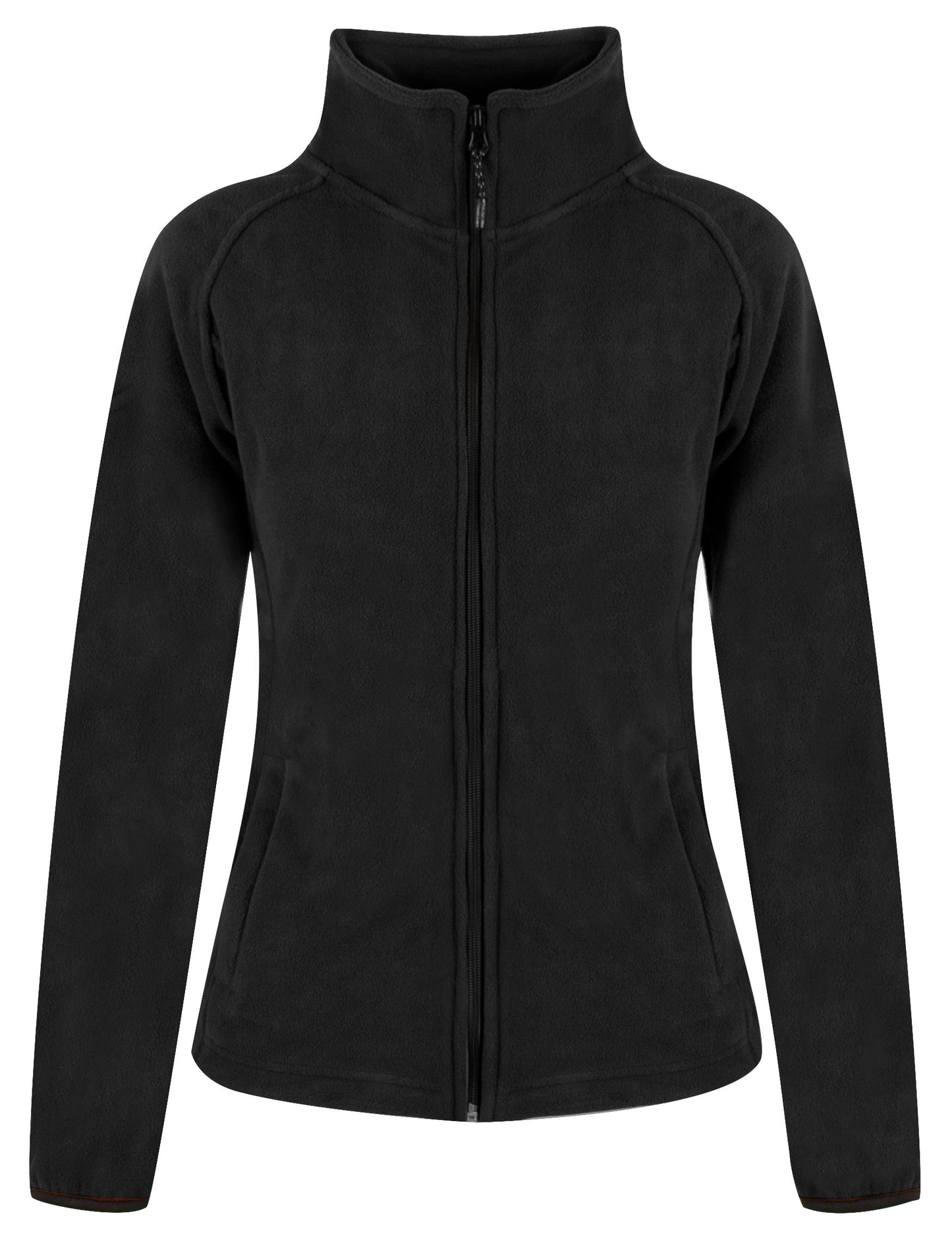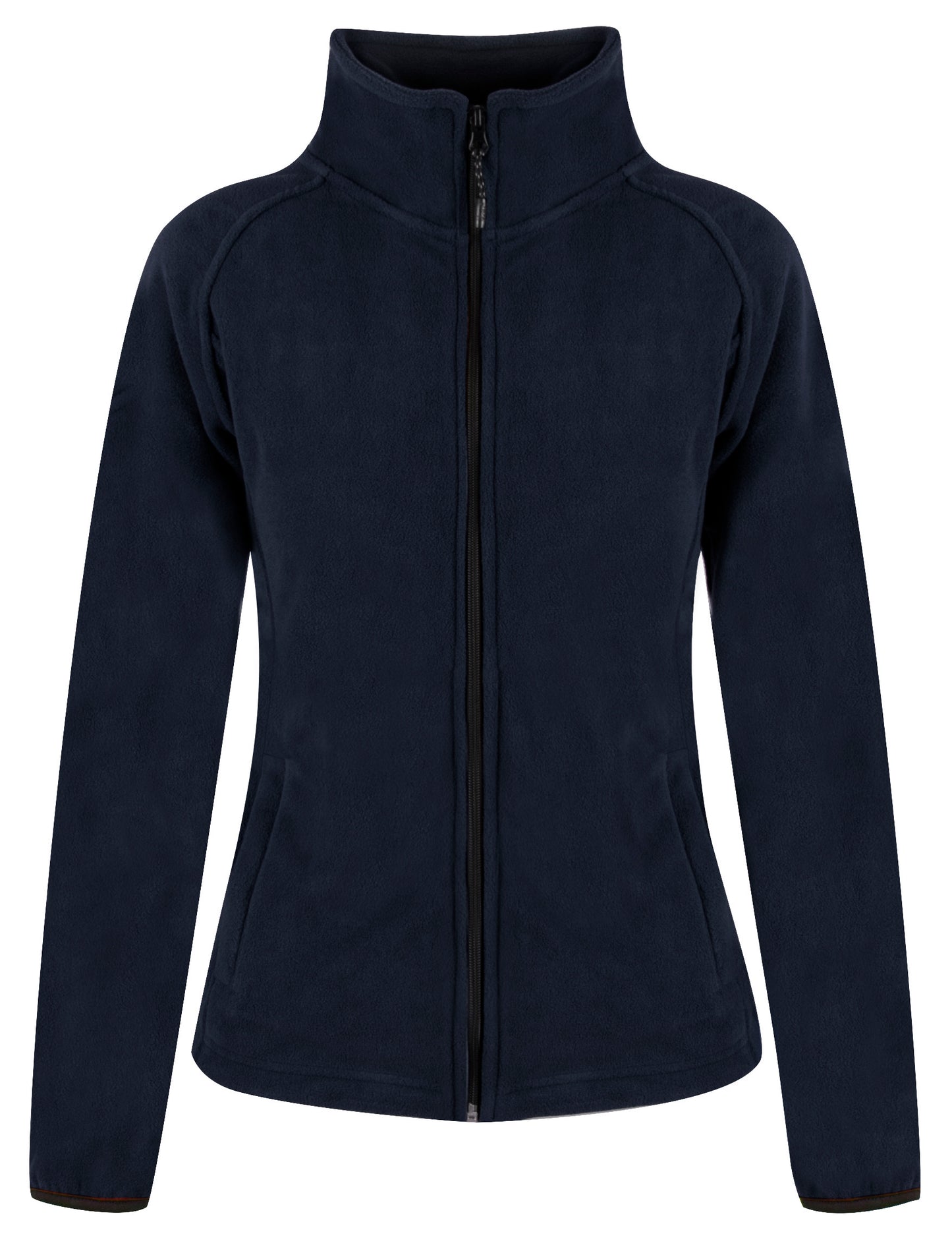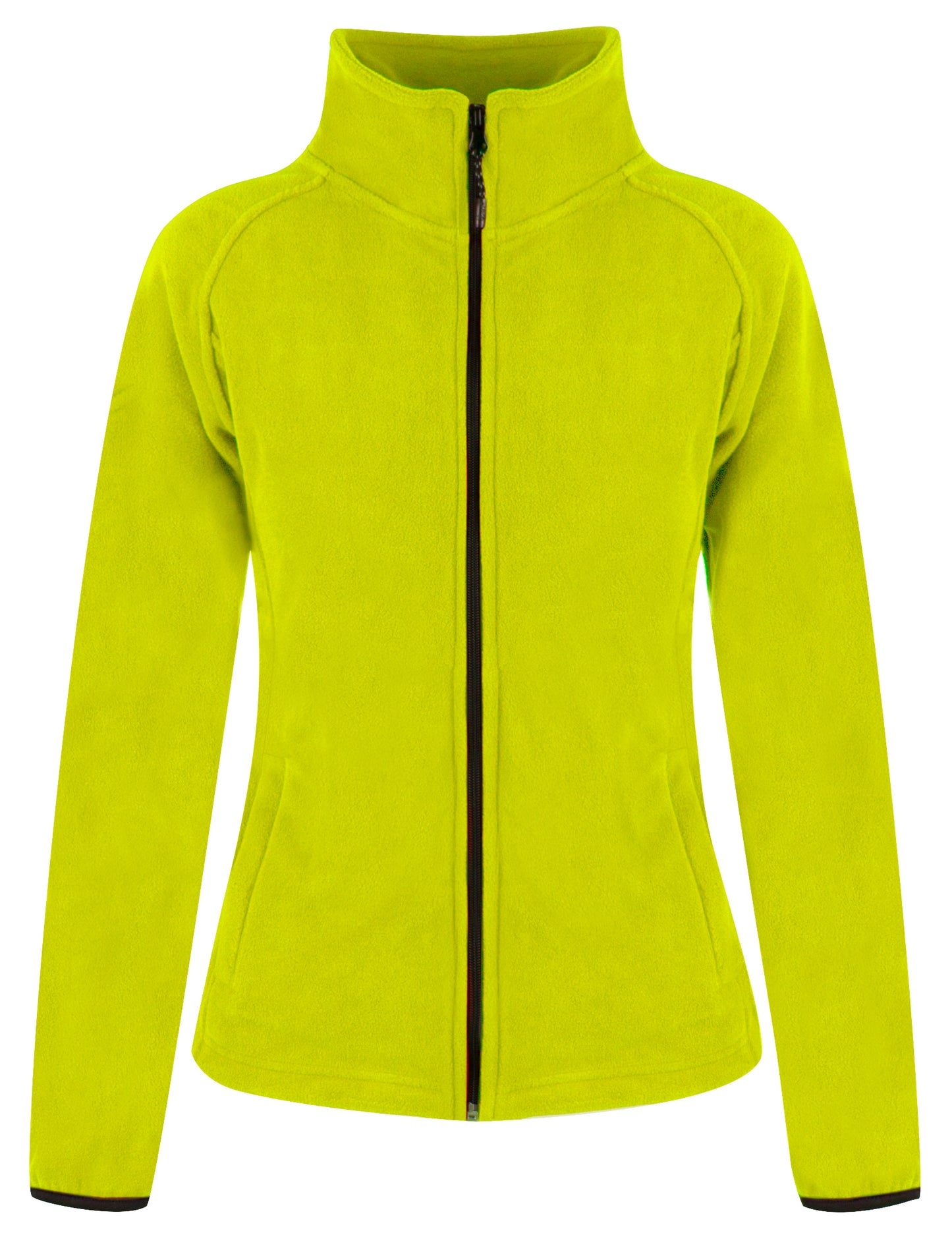 Figursydd polarfleecejakke til dame. Elastisk kontrastpiping og praktiske stikklommer. Antipill – behandlet.