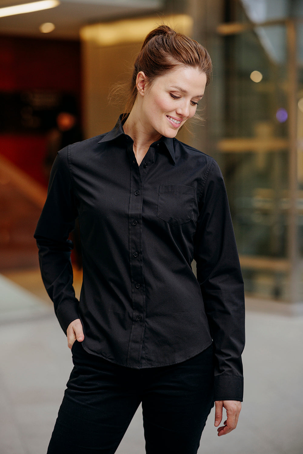 Figursydd poplinskjorte med brystlomme og lange ermer til dame. Regulerbare mansjetter. Strykelett og rask tørk. Matcher 8451 Venezia.