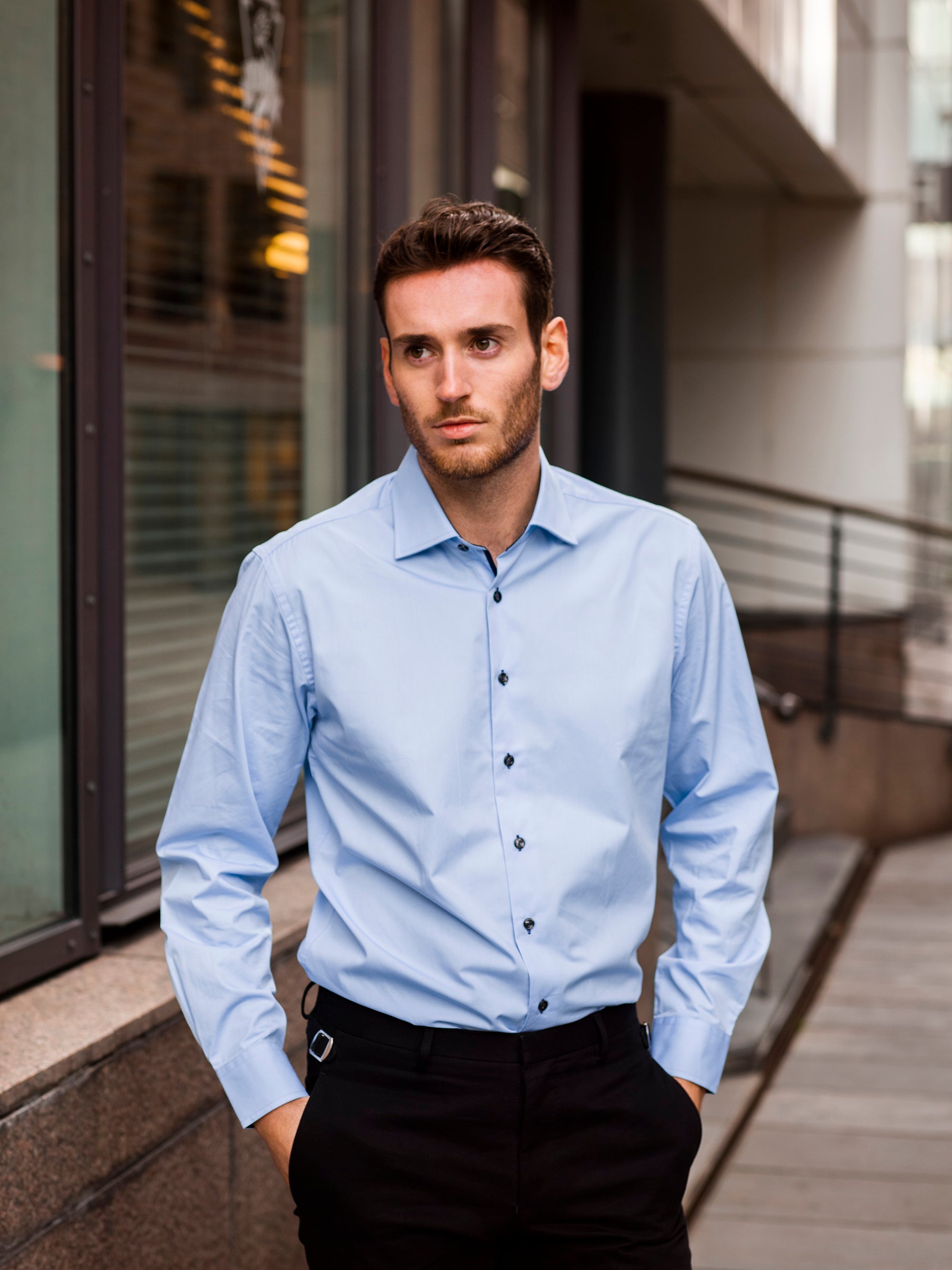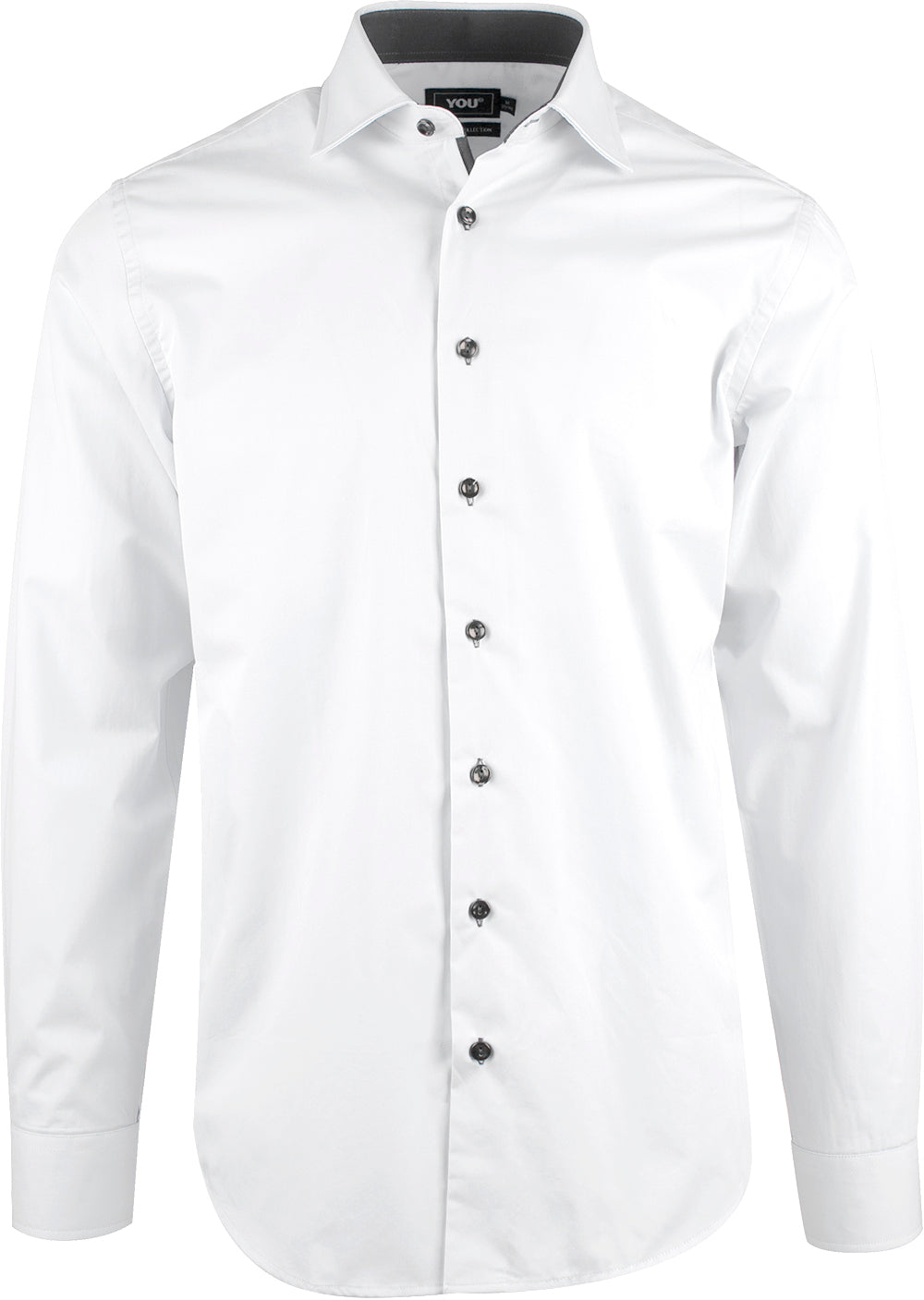Figursydd business skjorte til herre med innvendig kontrastfarge i kragen. Klassisk skjorte til herre. Strykelett og rask tørk.