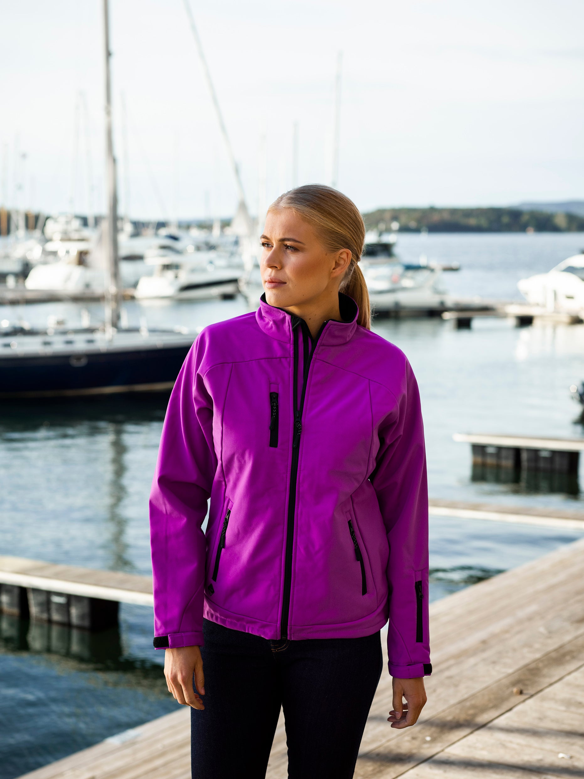 Softshelljakke til dame. Dekorative kontrastsømmer og detaljer. Elastisk og justerbar linning. Borrelås på ermer. YKK glidelås.