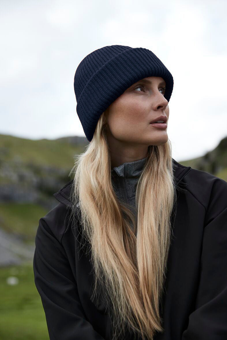 Vindtett ribbestrikket beanie. Inneholder minst 50% resirkulert polyester laget av 100% rPET, tilsvarende ca. 1,5 flasker etter forbrukeren. Konstruert krone og bomullsjersey fôr for komfort og pusteevne. Mansjettdesign for optimal dekorasjon. TearAway-label for enkel omprofilering.
