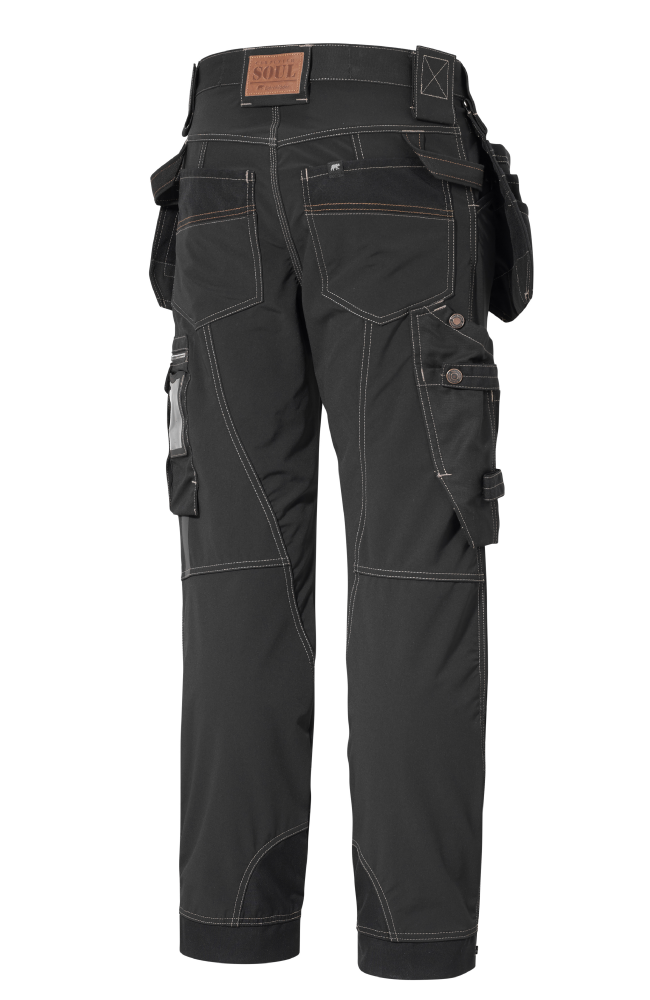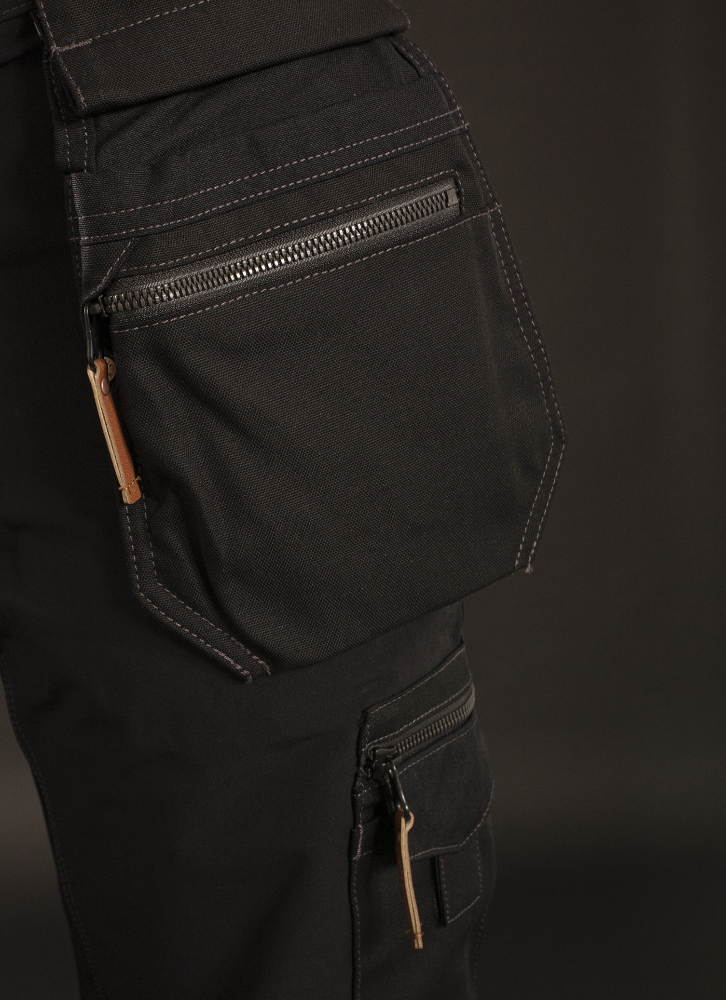 D-ring på begge hengelommer. Nøkkelbånd. Synlig ID-kortlomme. Doble hammarholdere, samt borrelåshempe i linning for feste av hammerholder (art. 331166).