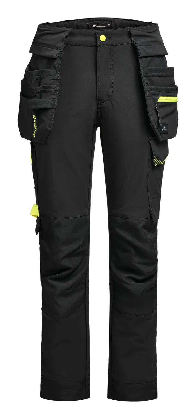 Sporty håndverksbukse i komfortabelt 4-veis stretchmateriale med gule kontrastdetaljer. Avtagbare og flyttbare hengelommer gir mulighet for å feste dem både på høyre og venstre side. Buksen kan justeres i midjen for økt komfort og bedre passform. Forsterkninger over knær og ved benavslutning gir ekstra høy slitestyrke.