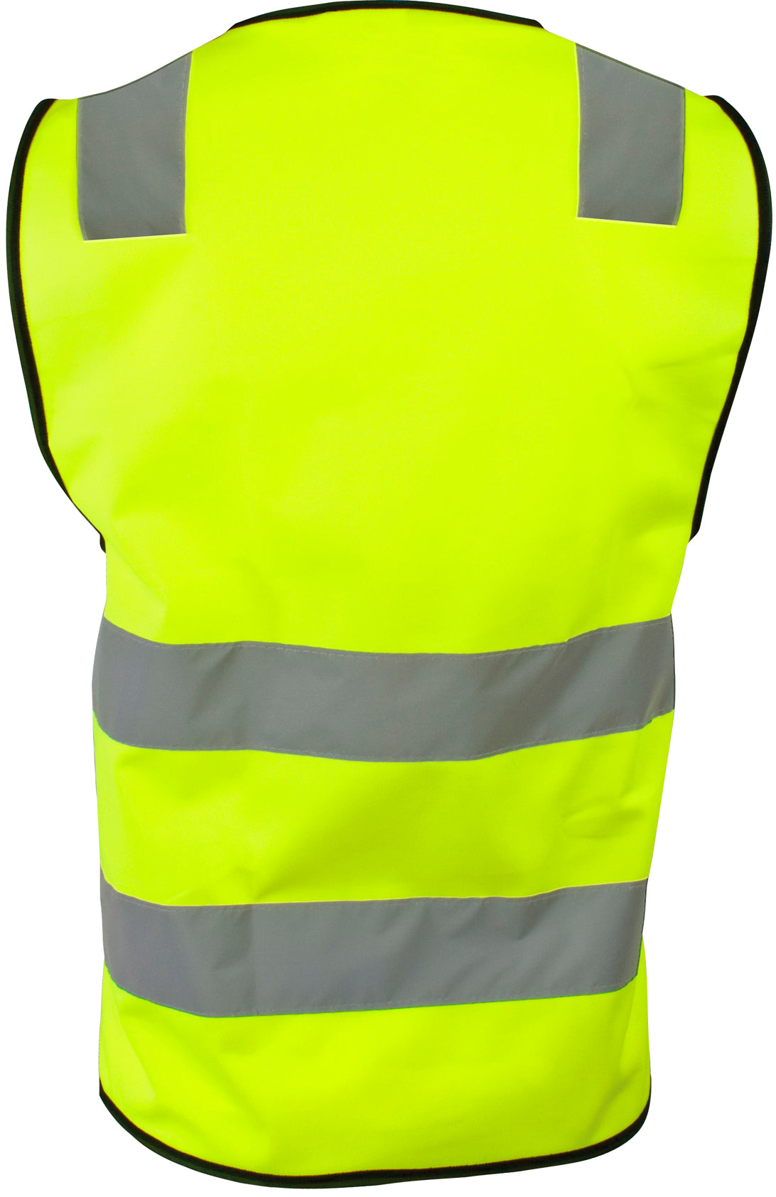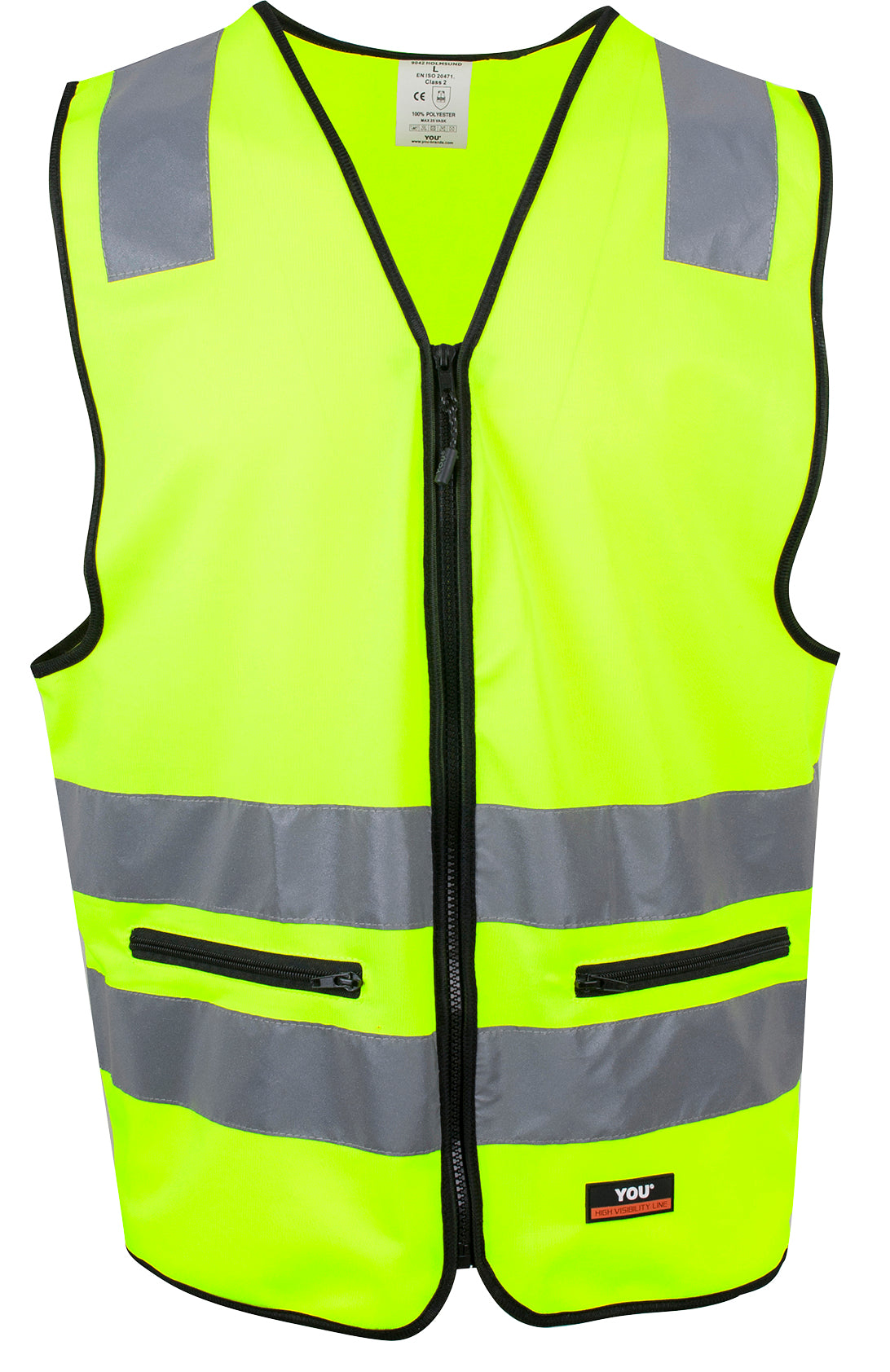 Unisex refleksvest til arbeidsbruk. Påsydde reflekser rundt midjen og over skuldre. Glidelås i front. Praktiske lommer i front med glidelås. CE-merket.