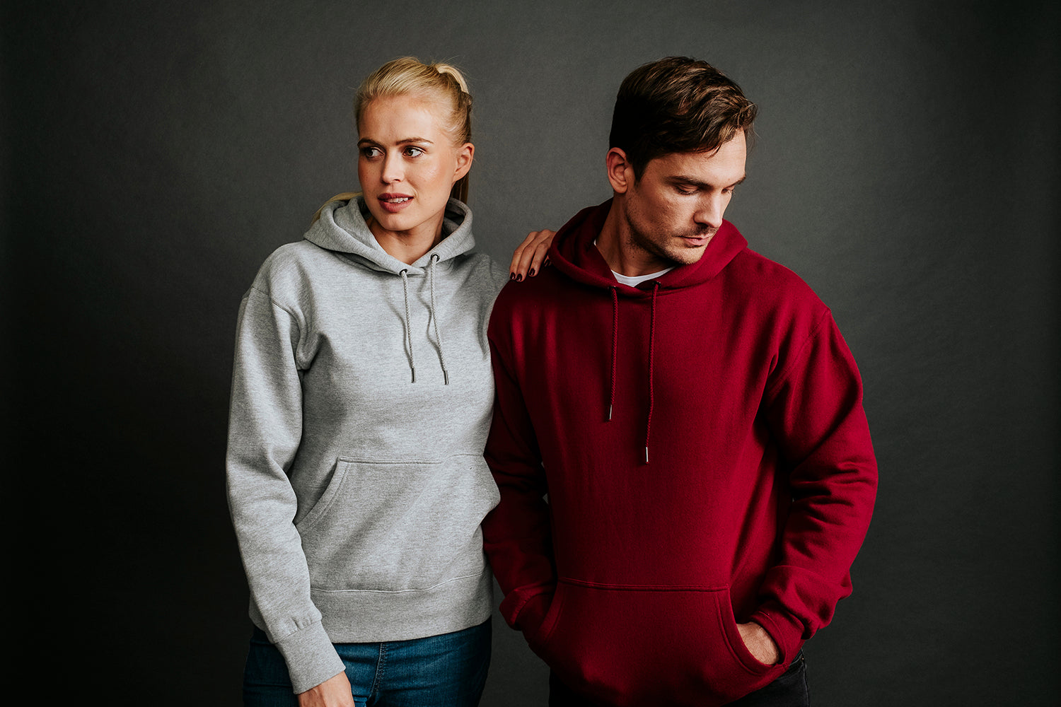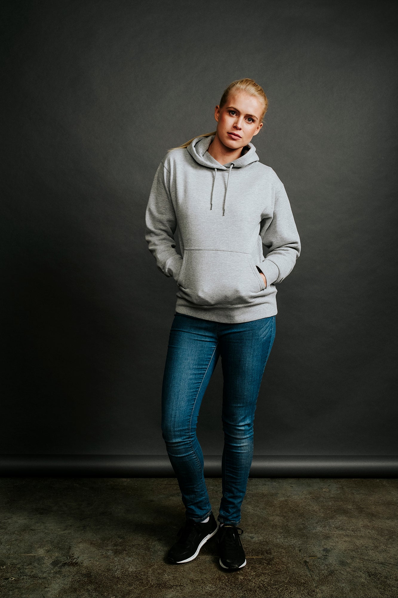 Bestselger hettegenser til dame. Lett figursydd. Dobbel jerseystrikket, flosset innside, forsterkede sømmer og lycra i alle ribber. Dobbel hette med snøring. Stikklomme med mediaport i front.