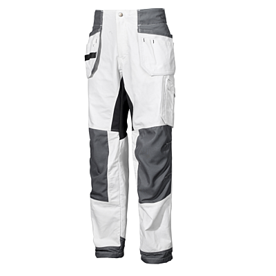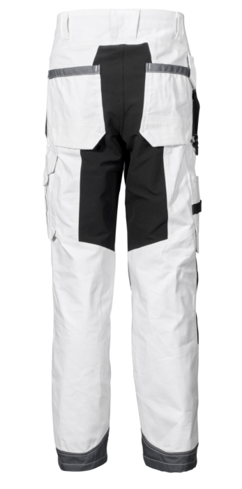 Håndverksbukse med stretch bak for økt komfort. Tilpasset malere, flisleggere, murere etc. Forsterkede hengelommer i front, hvorav en med tre rom. ID-kortlomme.