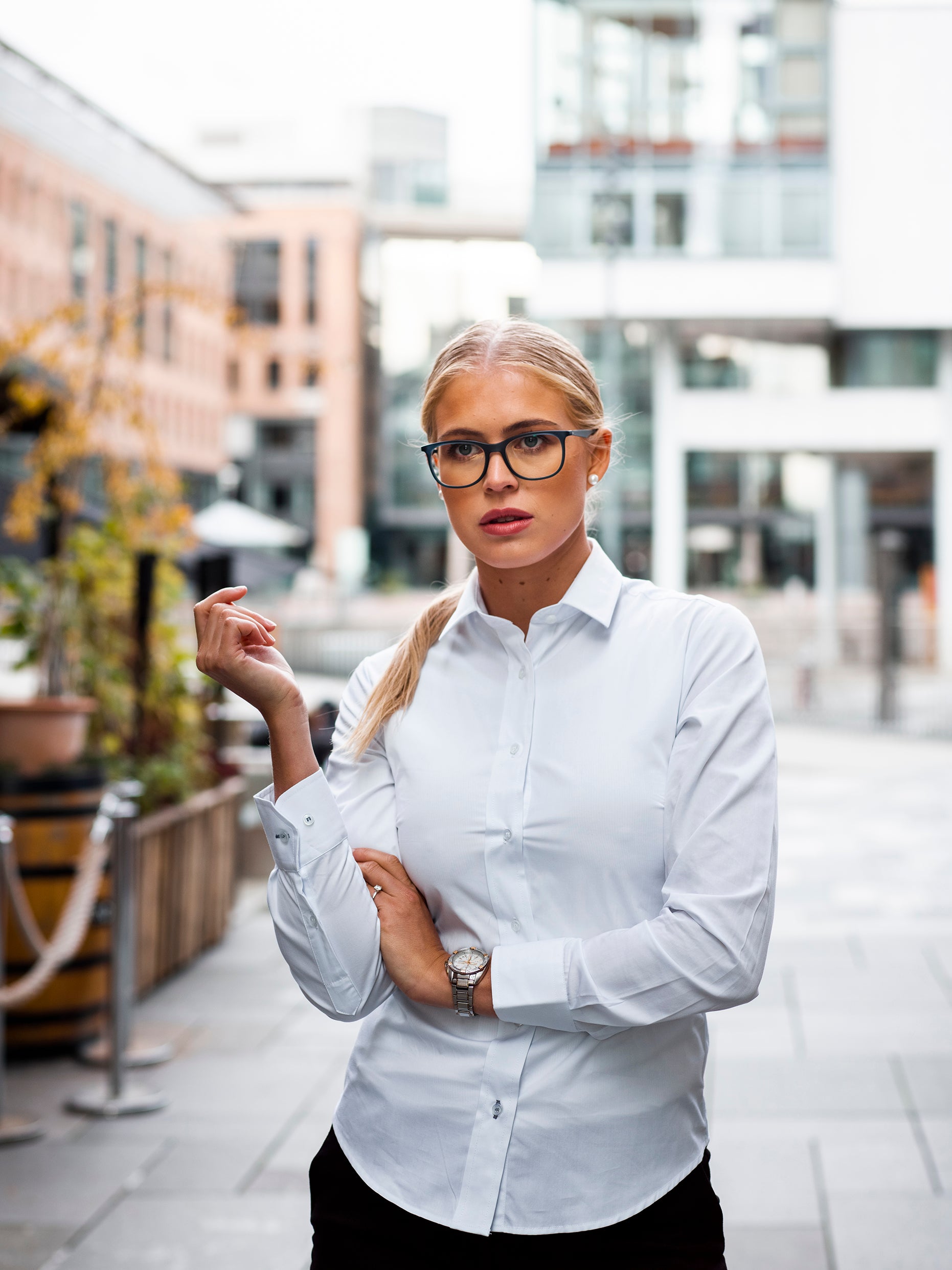 Figursydd business skjorte til dame med rød kontrastpiping i kragen. Klassisk skjorte til dame. Strykelett og rask tørk.