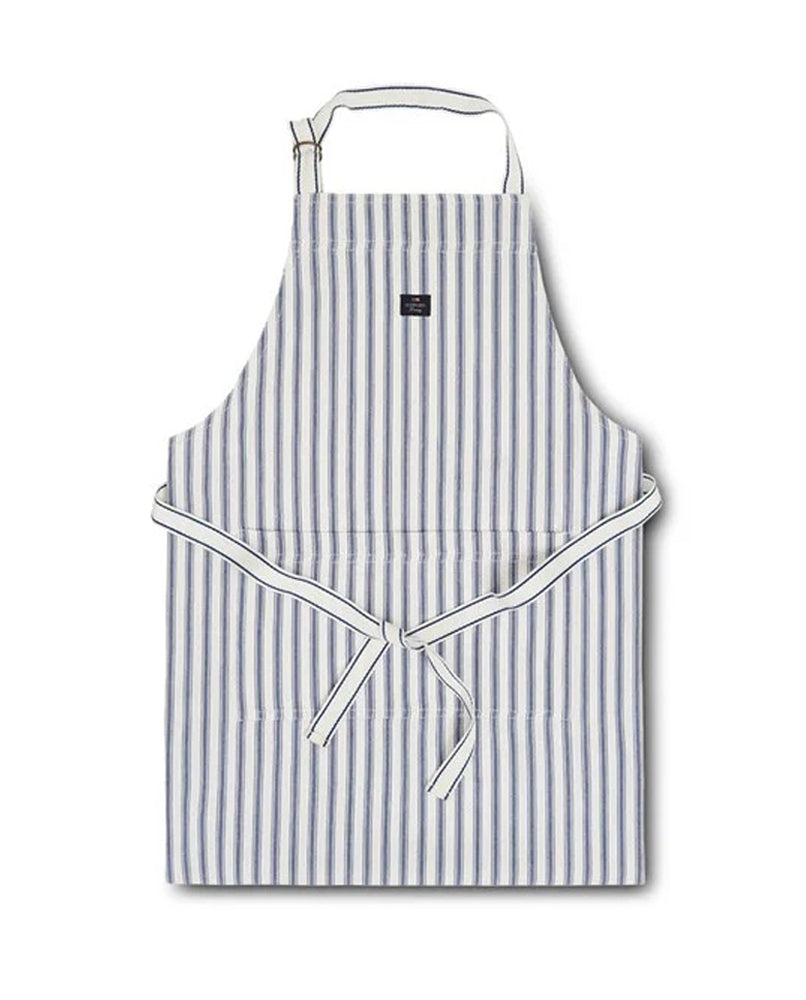 Dette forkleet med stilig stripemønster er i fiskebensvevd bomull. Bomullsforkleet har kanting i samme stoff og logomerke.