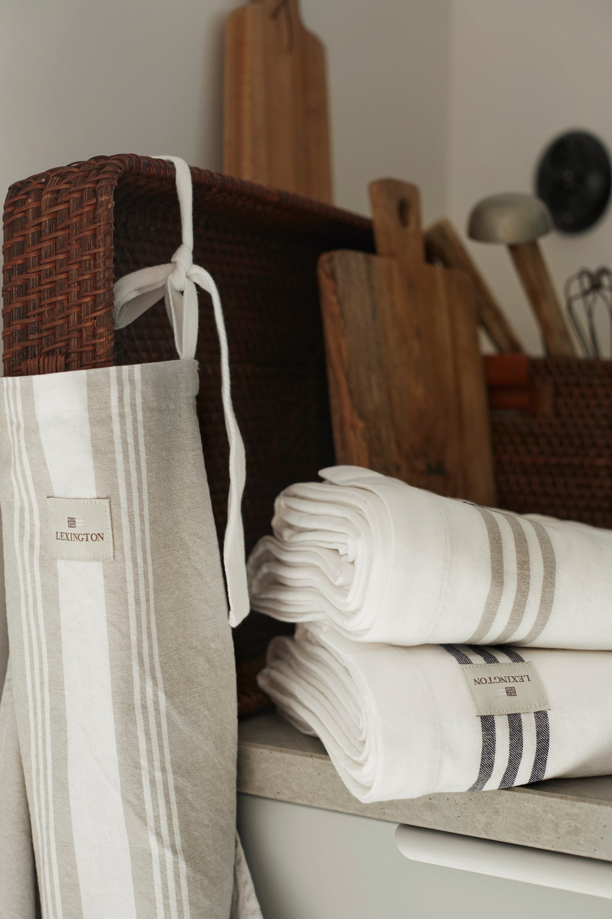 Kjøkkenforkle med knyting i nakke og rygg. Klassiske striper og Lexington logopatch på brystet.