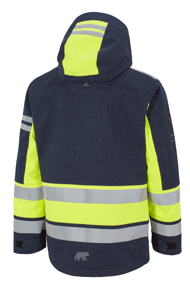 Skalljakke i nytt, naturlig flammehemmende materiale. Vanntett, vindtett og pustende kvalitet. Alle sømmer er teipet. Høy krage som beskytter mot vær og vind. Avtagbar og regulerbar hette med god plass til hjelm og visir. Glidelås i front bak klaff. Brystlommer med glidelåslukking og D-ring innvendig. To innvendige lommer, hvorav en med glidelåslukking. Sidelommer med glidelåslukking, hvorav høyre har D-ring og nøkkel-holder. Justering i nedkant og ved ermer. Forbøyde ermer.