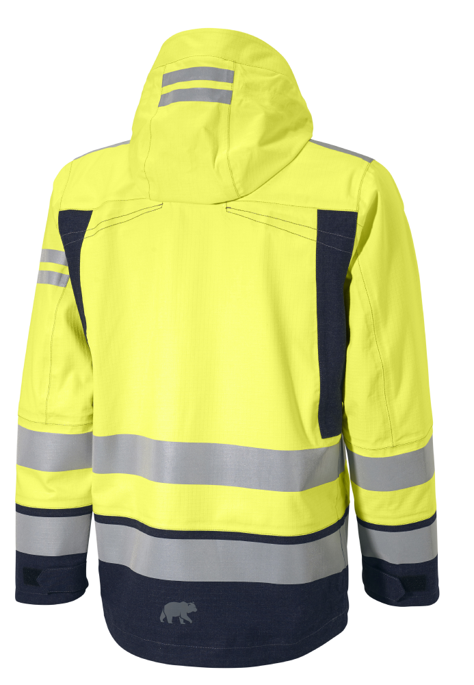 Skalljakke i nytt, naturlig flammehemmende materiale. Vanntett, vindtett og pustende kvalitet. Alle sømmer er teipet. Høy krage som beskytter mot vær og vind. Avtagbar og regulerbar hette med god plass til hjelm og visir. Glidelås i front bak klaff. Brystlommer med glidelåslukking og D-ring innvendig. To innvendige lommer, hvorav en med glidelåslukking. Sidelommer med glidelåslukking, hvorav høyre har D-ring og nøkkelholder. Justering i nedkant og ved ermer. Forbøyde ermer.
