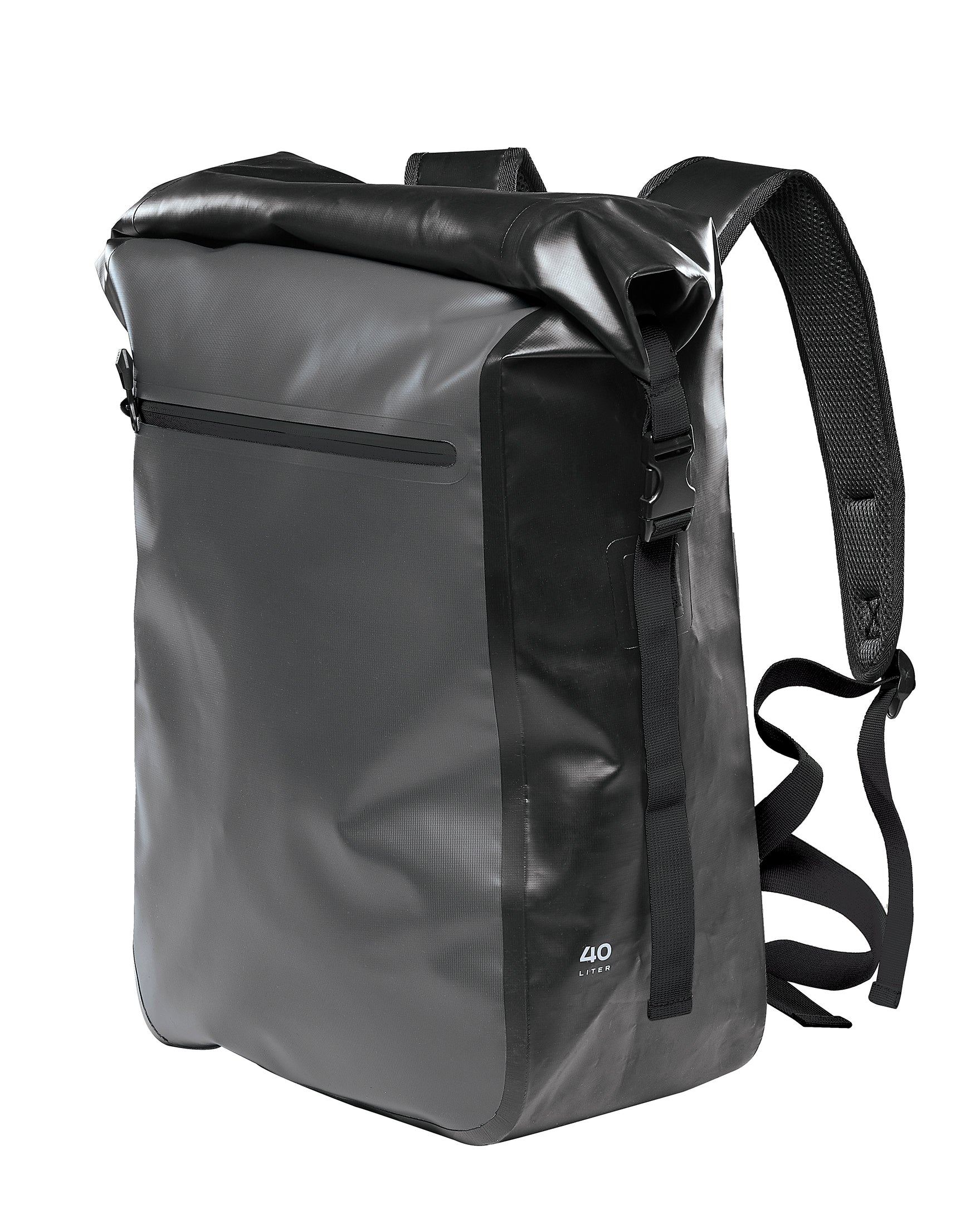 100% Vanntette sømmer, Slitesterk PVC, Rulletopp, Ergomomisk justerbare skulderstropper, Polstret rygg med god ventilasjon, Stor vanntett lomme, Kontrastsømmer og zipper