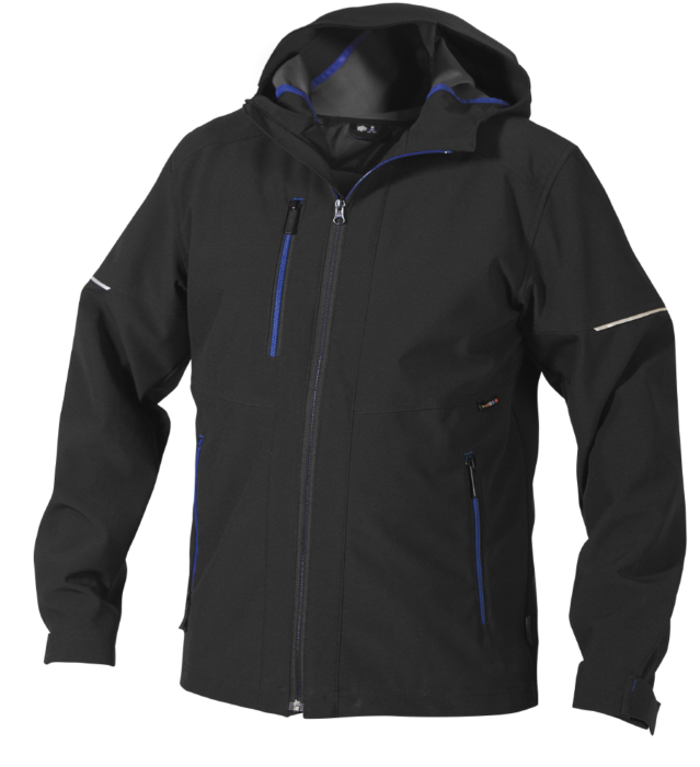 Lett og komfortabel jakke i trelags softshellmateriale. Svært pustende og vannavvisende kvalitet. Hette med reguleringsmulighet. Side lommer og brystlomme med glidelås. Innvendig lomme med glidelås. Justeringsmulighet i livet. Refleksdetaljer på ermer for synlighet.