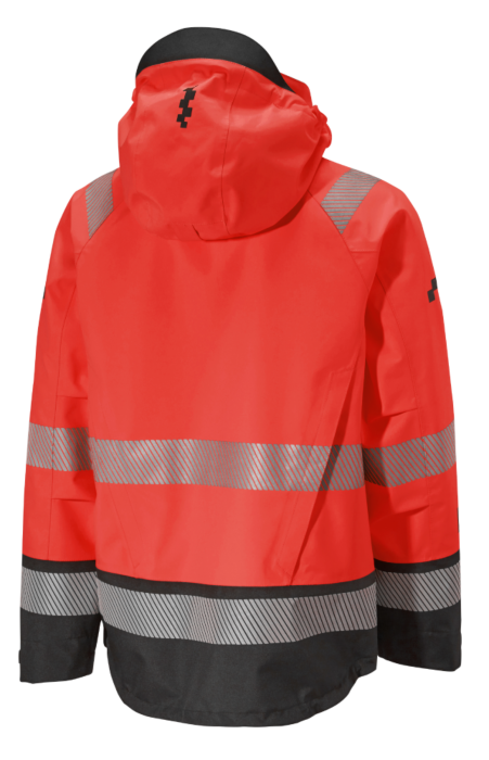 Vindtett, vanntett og pustende stoffkvalitet. Alle sømmer er teipet. Avtagbar og justerbar hette tilpasset hjelmbrukere. Ventileringsmulighet i sidene på ryggen. Forlenget rygg. Mykt materiale på innsiden av kragen for ekstra komfort. Regulering i ermet. To sidelommer med glidelås, brystlomme på høyre side med glidelås. Elastiske reflekser. ID-kortlomme.