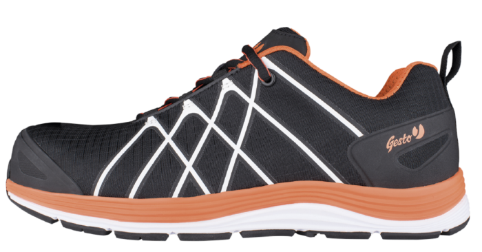 Lett og sporty vernejogg for tørt arbeid inne og ute, lettere industri, service, transport, lager/logistikk etc. Godkjent for bruk i ESD områder hvor statisk elektrisitet kan forårsake skade på følsomt elektronisk utstyr. Overdel i pustende mikrofiber, svart med hvite og orange detaljer. Bred lest. Polstret toppkant og pløse.